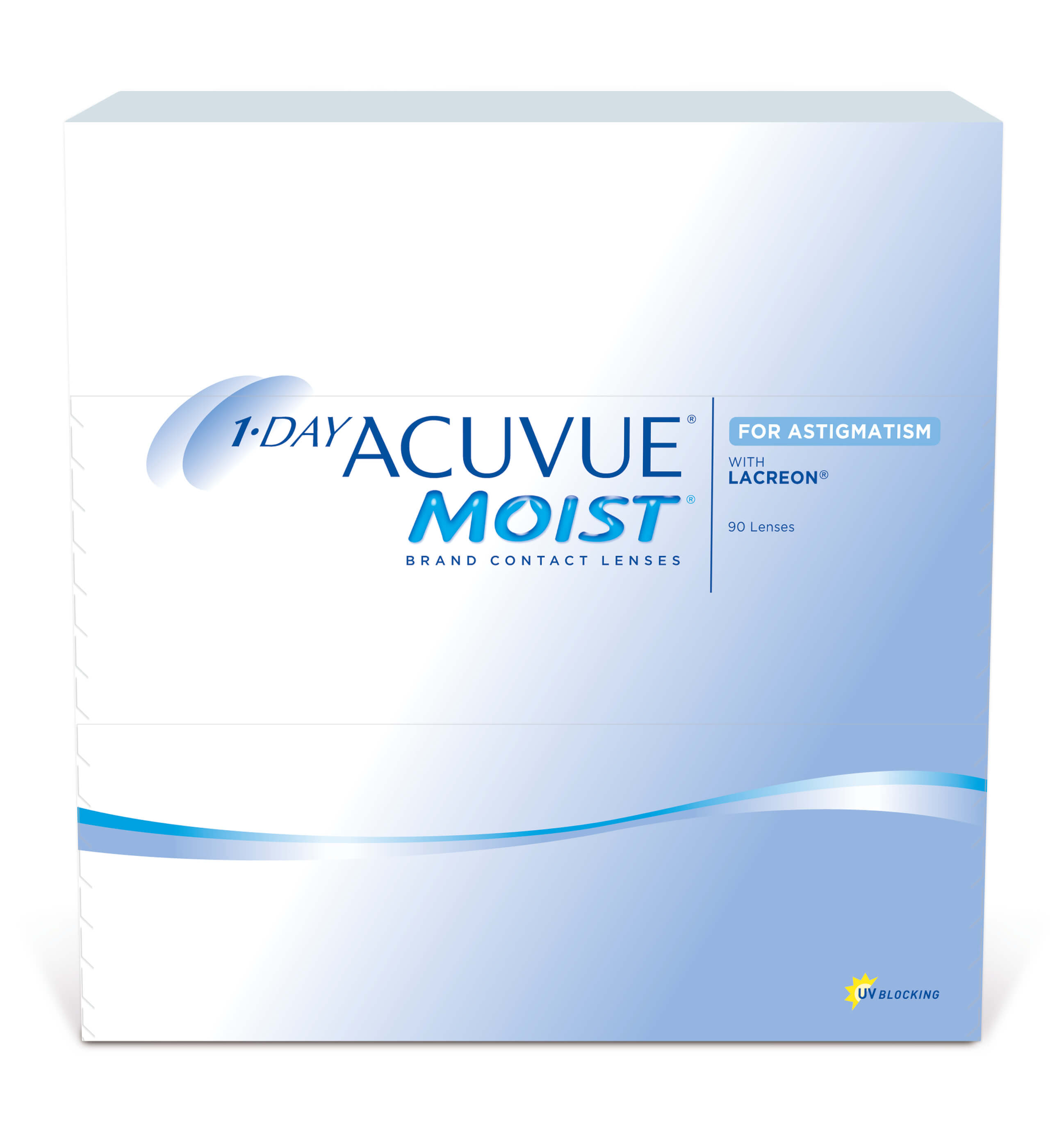 Introducing 1-Day Acuvue Moist Brand for Astigmatism. Along with the convenience of no solutions and no lens cases, we brought together our innovative blink stabilized lens design and the exceptional comfort of Lacreon Technology to form a lens like no other. It gives you consistently clear and comfortable vision from the moment you put them in, to the moment you toss them at the end of the day. 1-Day Acuvue Moist Brand for Astigmatism lenses help protect the covered portions of your eyes by blocking at least 82% of the UV-A radiation and 97% of the UV-B radiation.