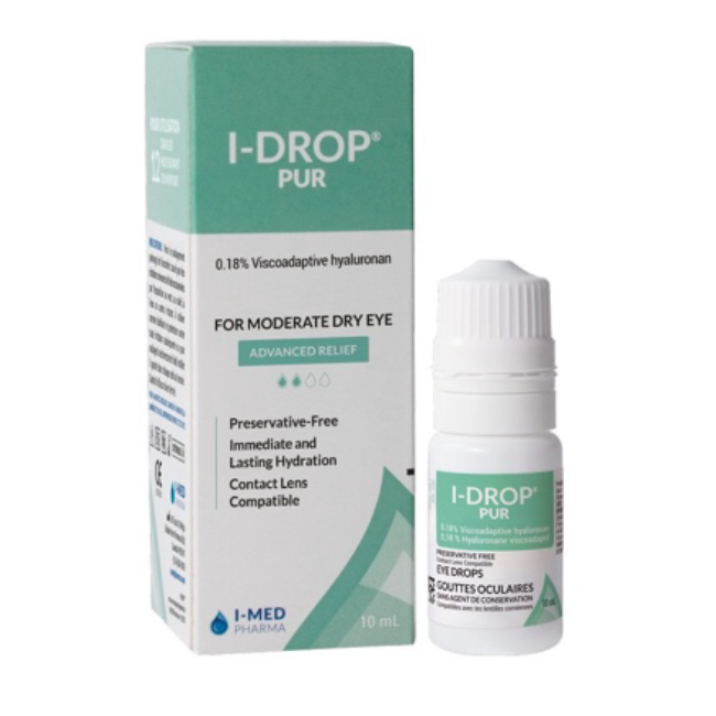 I-DROP PUR is a preservative-free, contact lens compatible artificial tear containing 0.18% viscoadaptive HA and is ideal for patients in need of advanced relief from mild to moderate dry eye disease. Itʼs a premium, viscoadaptive, preservative-free artificial tear that is highly effective at hydrating and lubricating the cornea. I-DROP is formulated with a top-quality hyaluronic acid component that contains a glycerin lubricant, which promotes excellent coating and recoating of the surface of the eye with every blink. It also offers a higher hydration capability, resulting in superior, longer-lasting comfort and relief for the patient. The bottleʼs sophisticated one-way valve dispenses 1 sterile dosed drop at a time and can be used for up to 12 months after opening.